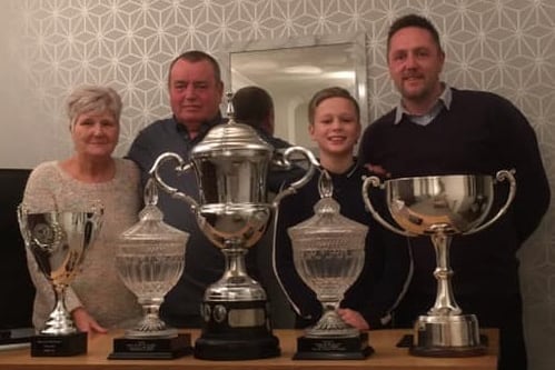 2019 also saw Richard's son Finley become heavily involved with the pigeons and his interest in the birds grew daily. He is pictured below with Mr and Mrs Winder with their haul of trophies won during 2019!